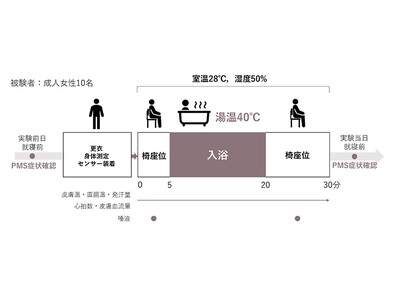 健康な成人女性10名を対象として入浴実験を実施しました。参加者の月経周期に留意して月経開始3~10日前の間に行い、実験日の前日と実験日の当日の就寝前にPMS症状に関する確認を行いました。実験室の環境は室温28℃、湿度50%とし、浴槽の温度は40℃に設定しました。対象者は実験開始後5分間、浴室内で椅坐位での安静をとり、その後浴槽へ移動し15分間の入浴を行いました。その後、浴槽を出て、再度椅坐位で10分間安静に過ごしました。実験は11時~15時の間に実施しました。