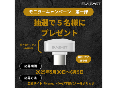 旭東エレクトロニクス(ブランドSUENAST)は世界最小クラスの外付けSSD、挿した際の出っ張り部分は10.6mm、読込速度450MB/sのSUNEAST Nanoシリーズを抽選で5名様にモニター提供いたします