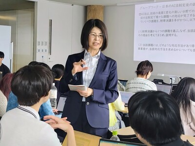 講義の後半では、人工知能技術研究・活用推進法案(AI法案)とその附帯決議を題材にしたグループワークを実施。学生たちは政策文書を読み解いて、その背景や影響・対応策を議論し、政策を「自分ごと」として考える体験を深めました。