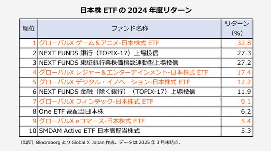 グローバルX ゲーム&アニメ-日本株式ETF【2640】が1位を獲得しました。日経平均株価が12%下落した2024年度、当ETFのリターンは+32.8%。2位のリターン+27.3%から大きく引き離して堂々の1位に。さらに同ランキングでは、上位10銘柄の半分をGlobal X JapanのETFが占める結果でした。