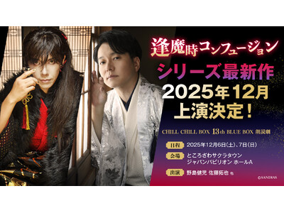 株式会社サンディアス(本社:東京都渋谷区、代表取締役:井出洋)は、2025年12月6日(土)・7日(日)の2日間、ところざわサクラタウン ジャパンパビリオン ホールAにて、CHILL CHILL BOX 13th BLUE BOX 朗読劇「逢魔時コンフュージョン」シリーズ最新作を上演いたします。出演は、主人公の天野静馬を演じる野島健児。そして鬼の羅叉を演じる佐藤拓也。