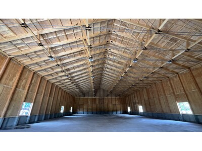 時代に求められる木造倉庫です。本商品の施工例として、野球を中心とした室内練習場「BLADES-GYM」(北海道士別市)にて、すでに導入されており、内覧も可能となっております。