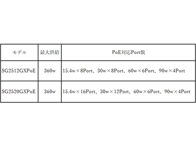 SG2512GXPoE(8ポートPoE)、SG2520GXPoE(16ポートPoE)のPoE(Power over Ethernet)モデルも順次販売開始する。