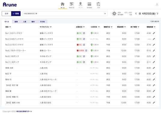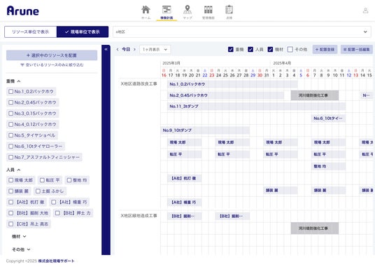 人員管理機能が大幅に強化されます。これにより「現場クラウド Arune」は、従来の重機管理に加え、人と重機の両方を効率的に管理できる「現場リソース管理システム」へと進化します。現場の段取りと稼働状況を可視化し、現場の業務改善をサポートします。