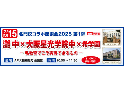 この度、毎回ご好評をいただいております「名門校コラボ座談会」の2025年度第1弾といたしまして、《灘中×大阪星光学院中×希学園》を下記要領にて実施いたします。 私立学校の名門、灘中学校と大阪星光学院中学校、その両校で長年教育に携わってこられた先生方に希学園理事長兼学園長が加わり三者で、教育について熱くご討議いただきます。昨今、高校授業料無償化の議論の中で、私立学校への期待が高まっています。しかし、そもそも私教育と公教育とは何が違うのでしょうか。私立中高一貫校を選ぶ意義を、今一度考えていきたいと思います。テーマは「私教育でこそ実現できるもの」です。私立学校の実情や本音を直接知ることができる貴重な機会となります。ぜひお誘い合わせの上、お気軽にご参加ください。