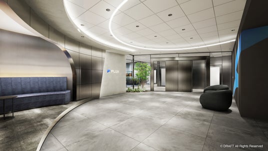 来客向けのエントランスです。洗練された空間にロゴから派生したFLUXのイメージを伝えるビジュアルアイデンティティを設置しました。