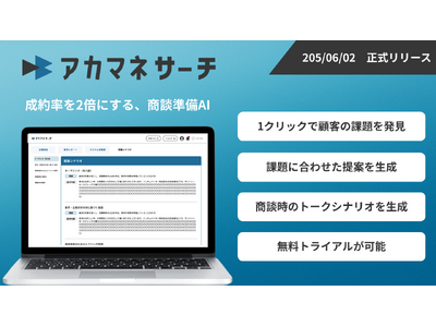 インキュベーション・エンタープライズセールス・AI活用を軸に、挑戦者の成功を支援するインキュベーター株式会社(本社:東京都渋谷区、代表取締役:八並 嶺一、以下 当社)は、AIを活用しBtoB営業の商談準備を効率化・高度化する新サービス『アカマネサーチ(※特許申請中)』を、2025年6月2日(月)より正式リリースいたします。リリースを記念して、先着300社を対象にレポート作成20回分の無料トライアルを提供することにいたしました。