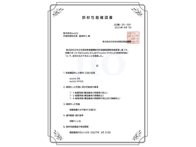 株式会社evoltz(本社:静岡県浜松市、代表取締役:渥美幸久)は、当社が開発・販売する木造軸組工法(在来工法)専用の制振装置「evoltz B5」「evoltz M185」が、株式会社日本住宅保証検査機構(JIO)による部材性能確認書(JIO確-25-001)を2025年4月1日付で取得したことをお知らせします。