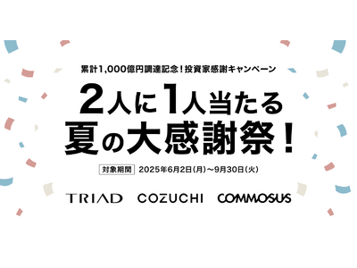 COZUCHI&COMMOSUS投資家限定ギフトキャンペーン、累計1,000億円調達記念!2人に1人当たる夏の大感謝祭!