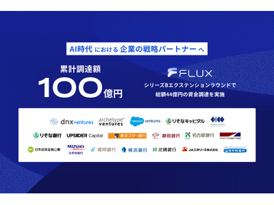 株式会社FLUX(読み:フラックス、本社:東京都渋谷区、代表取締役:永井元治、以下「FLUX」)はDNX Ventures、Archetype Ventures、Salesforce Ventures、りそなキャピタル、みらい創造インベストメンツらを引受先とする第三者割当増資および融資等を合わせて、総額44億円の資金調達をシリーズBエクステンションラウンドにて実施したことをお知らせいたします。今回の調達によりシリーズB全体の調達金額は88億円、累積資金調達額は100億円に到達します。