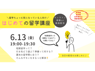 そんな声に応えて、株式会社イクシル(本社:神奈川県川崎市、代表取締役CEO:伊藤 千佳子)は、毎月開催している留学初心者向けのオンラインセミナー「はじめての留学講座」を6月も無料開催いたします。