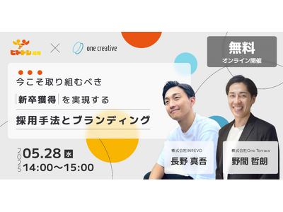 企業ブランディング支援サービス「One Creative」を提供する株式会社One Terrace(本社:東京都港区、代表取締役:石中達也)は、2025年5月28日(水)に成果報酬型RPO「ヒトトレ採用」などを展開する株式会社INREVO(本社:福岡県福岡市、代表取締役:南晴仁)と共同で無料オンラインセミナー『今こそ取り組むべき「新卒獲得」を実現する「採用手法とブランディング」』を開催し、アーカイブの配信を開始いたしました。アーカイブ動画は以下の「詳細を見る」よりご覧いただけます。