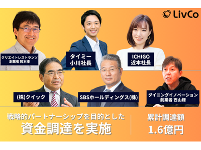 外国人特化型HRプラットフォーム事業(特定技能外国人紹介事業)を展開する株式会社LivCo(本社:東京都新宿区、代表取締役CEO:佐々翔太郎、以下 LivCo)は、株式会社クイック、株式会社タイミー代表取締役小川嶺氏、株式会社レインズインターナショナル/株式会社Dining Innovation創業者西山知義氏、株式会社ICHIGO代表取締役近本あゆみ氏、SBSホールディングス株式会社、株式会社クリエイト・レストランツ・ホールディングス創業者岡本晴彦氏を引受先とする第三者割当増資を実施したことを発表いたします。今回の資金調達により累計の資金調達総額は1.6億円となりました。本ラウンドでは単なる出資だけではなく戦略的パートナーシップを目的とし、様々な形のシナジーを産んでいけるエンジェル投資家・事業会社の方々に参画頂きました。(資金調達の背景についての記事はこちら)