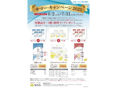 医療機関専用サプリメントの開発・製造・卸販売のほか、医療機関におけるオーソモレキュラー栄養療法の導入・実践をトータルサポートする株式会社MSSでは、2025年6月2日(月)13:00~7月31日(木)13:00まで、「サマー・キャンペーン 2025」を開催しています。