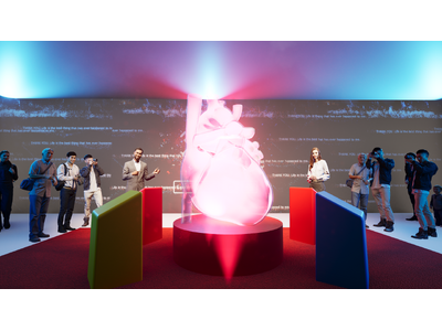 inochi Equity Heartを中心に、inochiのペイフォワードで実現する循環モデルを体感いただけるような展示会場。 それぞれのヘルスデータや言葉がinochi Equity Heartの鼓動に支えられ上空に舞い上がり、天井のLASTWORDS DATA CLOUDにて互いに作用しあいながら支え合う、inochiのペイフォワードが描く循環の姿を表現します。