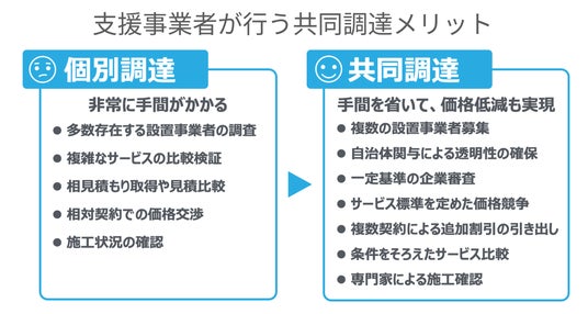 本事業では、支援事業者が一定の基準で比較・評価し、導入希望者にとって最適な事業者選定が容易に行えるようにしつつ、設置事業者の提案活動にかかる負担を低減することで、サービス価格の低減を目指します。