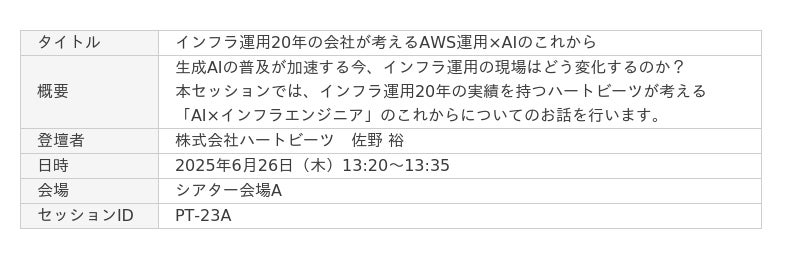 株式会社ハートビーツ(本社:東京都新宿区、代表取締役:藤崎 正範、以下「ハートビーツ」)は、2025年6月25日(水)・26日(木)に幕張メッセにて開催される日本最大のアマゾン ウェブ サービス(以下 AWS)を学ぶイベント「AWS Summit Japan 2025」に Silverスポンサーとして協賛いたします。