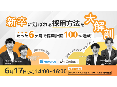 株式会社HR Force(本社:東京都中央区、代表取締役社長:村田 泰子、以下HR Force)とCoalition株式会社(本社:東京都目黒区、代表取締役社長:高橋 慧、以下Coalition)は2025年6月17日(火)「新卒に選ばれる採用方法を大解剖~たった6ヶ月で採用計画100%達成!~」セミナーを開催することをお知らせします。