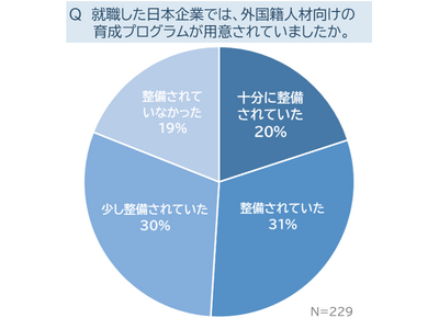 日本で働く海外人材に、就職した企業で海外人材向けの育成プログラムが用意されていたかを聞いたところ、「十分に整備されていた」が20%、「整備されていた」が31%で、育成プログラムが整っている職場は計51%と約半数にとどまりました。「少し整備されていた」「整備されていなかった」の合計は49%で、半数は、育成プログラムが十分でなかった、と回答しています。
