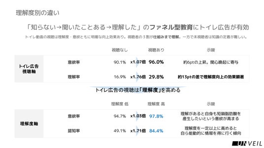 お手洗いは視覚的な集中を妨げるノイズが少なく、利用者が集中してコンテンツを見やすいといった特徴があります。実証実験では、広告の認知度約95%、配信したコンテンツの理解度約70%、興味関心や推奨などの態度変容率58.9%、認知リフト率および理解リフト率がそれぞれ613%向上、560%向上といったトップ・ミドルファネルの推進効果が確認されました。
