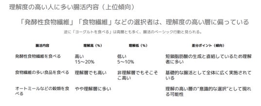 更に、理解度が高い層の腸活方法としては、「発酵性食物繊維を食べる人」の割合が理解度の低い層と比べて高く、これは、それらの食事が「腸内細菌のエサ」であり短鎖脂肪酸の産生と直結していることまでを理解しているからこその行動であると考えられます。