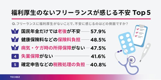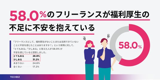 一方、フリーランスは自由な働き方や専門性の追求を選択できる特徴がありますが、企業に属する就業者と異なり、福利厚生制度の恩恵を受けられないことが多く、自分自身で手配・費用負担する必要があります。テックビズが実施した調査では、フリーランスの58.0%が福利厚生の不足を感じており、特に健康管理、税務処理、資金繰りなどの分野での支援ニーズが高いことが明らかになりました。