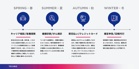 春は新生活サポート(キャリア相談・各種保険)、夏は健康管理サポート(健康診断・がん検診)、秋は資金サポート(即日払い・クレジットカード)、冬は業務効率化サポート(確定申告・記帳代行)として、フリーランスの多様なライフステージに対応した年間を通じてのトータルサポートを実現いたします。