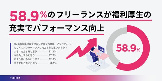 また、同調査によると、フリーランスの58.9%が、福利厚生面での安心が得られれば、パフォーマンスが向上すると考えています。これは福利厚生の不足が単なる待遇の問題を超えて仕事の質や生産性にも影響を与えている可能性を示唆しており、本サービスの重要性を裏付けています。