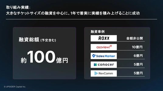 株式会社UPSIDERが持つAI技術を用いた与信モデルと、株式会社みずほフィナンシャルグループが持つ深い専門知識とネットワークを掛け合わせたデットファンド「UPSIDER BLUE DREAM Fund」は、特にミドル・レイターステージのスタートアップを対象に、「ともに、速く、遠くに」をキャッチコピーに最大規模の融資を最短1週間で実行することを掲げ、2024年12月末時点で約100億円の融資実績を持っています。