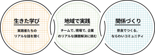 「ならわい」は、生きた学び、地域での実践、関係づくりがひとつに重なったプログラムです。実際に事業をつくってきた起業家たちの経験を学び、企業のリアルな課題と向き合い、現場に足を運びながら仲間とともに企画をつくります。各回、学びのコンテンツを準備しており、ゲストである奈良の起業家たちの経験に基づく、志の立て方やビジネスモデルや戦略のありかた、チームビルティングやコミュニケーション、プロジェクトを円滑に進めるための知見等、参加者向けにトークセッションとして開講します。