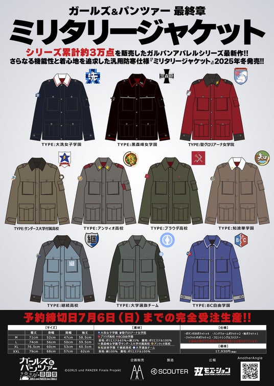 このようにご好評をいただいているAnotherAngleガルパンアパレルシリーズでございますが、ガルパンファンの皆様にもっと愉しんで、そして、いつも身に着けていただきたいと思い、今冬の新アイテムとして汎用防寒仕様『ミリタリージャケット』全10種を2025年冬に発売することに決定いたしました。
