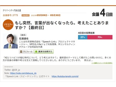 「もし突然、言葉が出なくなったら。考えたことありますか?」。議長に、言語リハビリアプリの開発を進める石渡達也氏(ことばの天使株式会社「Speech Link」プロジェクトマネージャー他)を迎え、2025年5月9日(金)から30日(金)まで、4回にわたり議論を行いました。