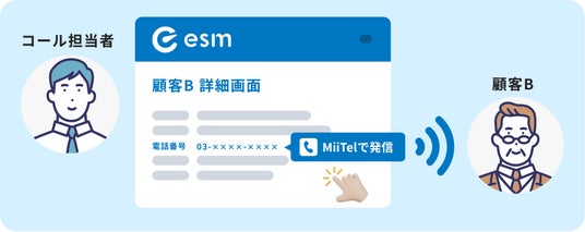eセールスマネージャーとMiiTel Phoneを連携することで、eセールスマネージャーを起点としたクリックトゥコールによるアウトバウンドコールの促進や、着信時の顧客情報ポップアップ表示、通話日時や通話履歴の確認によるインバウンドコールの効率化を実現します。