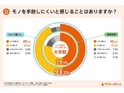 「使わないけれど捨てられないモノがある」と感じている人は現代の日本で多く見られ、住まいへの満足度にも何らかの影響を及ぼしていると考えられます。調査結果からは、ひとり暮らしで93.3%、同居世帯でも8割近くが「モノを手放しにくい」と感じており、住環境にかかわらず多くの人が“モノの呪縛”に悩まされている様子が明らかになりました。