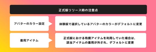 - 体験版の終了に際して一部のアバターアイテムが有償化されました。有償アイテムを利用していた場合には当該アイテムの着用が解除され、デフォルトに戻っております。同じアイテムを引き続きご利用いただく際はアプリ内で購入いただく必要がございます。