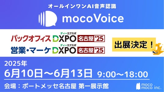 mocoVoice」を、2025年6月10日(火)~13日(金)にポートメッセ名古屋 第一展示館で開催される「バックオフィスDXPO 名古屋’25」および「営業・マーケDXPO 名古屋’25」に出展いたします。高精度な書き起こし・校正・議事録作成を、その場でお試しいただけます!