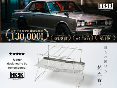 名車「NISSAN SKYLINE 2000GT-R(通称:ハコスカ)」へのリスペクトから生まれた“HAKOSUKA”は、直線的で無骨な構造美と高い機能性を備えた焚火台。その哲学を表現した本映像は、まるで映画の予告編のような仕上がりで、視聴者を一瞬で引き込みます。