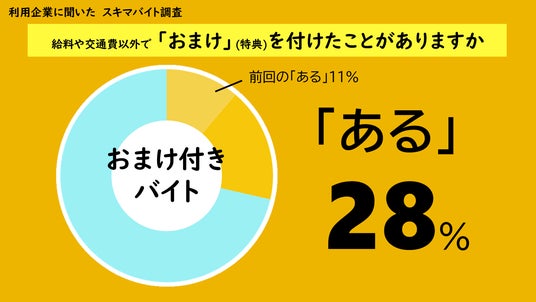 「給料・交通費以外で、おまけ(特典)を付けたバイト募集を行ったことがあるか」の質問(n=335)に、前回の調査(2025年2月)では「スキバイト利用企業」全体の11%が「ある」でしたが、