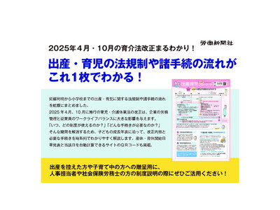 株式会社労働新聞社(本社:東京都板橋区、代表取締役社長:森川泰孔)は、2025年6月10日(火)に『出産 育児 フローシート(2025年版)』(発行元:(株)トータル人事システム、監修:労働新聞社、編集:SI-MooT)を刊行しました。