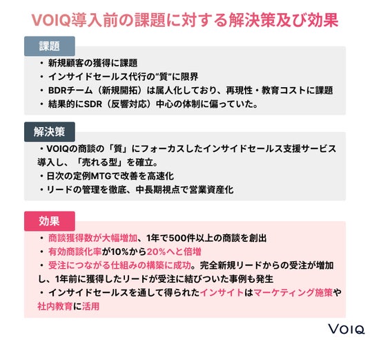 MIL株式会社では、インタラクティブ動画プラットフォームの提供を通じて既存顧客との深耕を進める一方、新規顧客の獲得には長年課題を抱えていました。特にインサイドセールス(以下IS)においては、過去にアウトソースを活用した経験がありながらも、「アポイントの数は出ても質が伴わない」「受注に繋がらない」「活動がブラックボックス化する」といった問題に直面。社内での内製化も試みたものの、属人的な対応に依存し、スキルの再現性やリソースの限界に悩まされていました。そこで同社は、ISの役割を「量の確保」から「質の担保」へと進化させるべく、VOIQ株式会社による本質的な営業支援の導入を決定。「ターゲット戦略から毎日の改善まで一気通貫で伴走する姿勢」が決め手となりました。