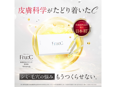*輸出国:中国・香港・台湾・シンガポール・マレーシア・ベトナム・タイ ほか、**2024年2月~2024年4月までのfru:C美容液定期継続率、***テトラ2-ヘキシルデカン酸アスコルビルEX(有効成分),リン酸L-アスコルビルマグネシウム(保湿成分)、****毛穴の目立つ肌にうるおいを与える