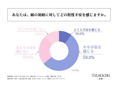 続いて、初経を迎えた9歳~15歳の娘を持つ30代~50代の母親を対象に「娘の初経に対してどのような不安を感じたか」を尋ねる設問への回答では、1位が「初経のタイミングが予測できないこと」で48.6%、2位が「学校生活への影響」で40.5%、3位が「体調の変化に対応できるかどうか」で37.3%という結果になりました。この結果から、娘の初経に対して最も不安を感じたことは、「初経のタイミングが予測できないこと」であることがわかりました。