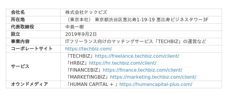 テックビズは、「働き方を変え、世界を変えていく」をスローガンに掲げ、国内最大級のITフリーランス向けエージェント「TECHBIZ」をはじめとした、個人と企業のマッチングサービスを提供しています。専任コンサルタントによる、テクニカルスキルとヒューマンスキルの双方からの高品質なマッチングによって、継続稼働率約97%を実現しています。2021年より3年連続「アジア太平洋地域における急成長企業ランキング」にランクインしています。創業以来、「人生を豊かにする新たな働き方の創造」というパーパスのもと、フリーランスにはより主体的に働ける場と環境の提供を、企業には、人材不足やDX化といった変化の激しい社会における、持続的な成長の支援をすることで、人生を豊かにする新たな働き方の創造を目指しています。