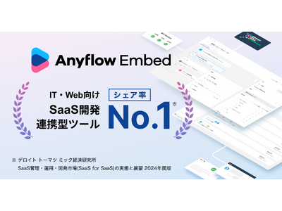 Anyflow株式会社(本社:東京都港区、代表取締役CEO:坂本 蓮、以下Anyflow)は、システム開発企業向けのAPI連携プラットフォーム「Anyflow Embed」は、デロイト トーマツ ミック経済研究所株式会社が発行する「SaaS管理・運用・開発市場(SaaS for SaaS)の実態と展望 2024年度版」においてIT・Web向けSaaS開発連携型ツールとしてシェア率No.1を獲得したことを発表いたします。