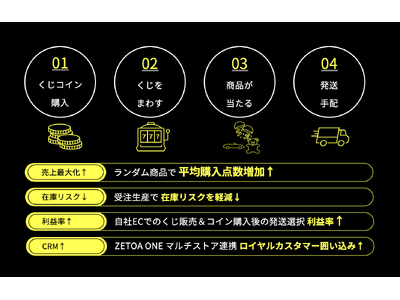 「ZETOA KUJI」は、ユーザーがコインを購入し、ランダムにくじを引くことでグッズや商品を獲得できるオンラインくじサービスを、スピーディかつ柔軟に構築可能なパッケージです。ShopifyベースのEC環境に対応しており、くじの設計から販売、当選処理、商品発送までを一気通貫で管理できます。