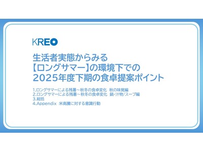 生活者視点をベースにマーケティングとプロモーションを提案する株式会社クレオ(本社:東京都千代田区、代表取締役社長:横井 司)は、2025年6月12日(木)より独自の調査結果を活用した「生活者実態からみる 【ロングサマー】の環境下での2025年度下期の食卓提案ポイント」のレポートを発売いたします。
