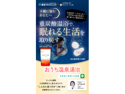 東京TMクリニック(東京都渋谷区・代表医師:林田泰斗)は、株式会社ホットアルバム炭酸泉タブレット(東京都新宿区・代表:小星重治)と連携し、無添加・ノンケミカルな重炭酸入浴剤「ホットタブ」を活用した“おうち温泉湯治 快眠プログラム”を2025年6月13日より開始いたします。本プログラムは、医師監修と専門家のLINE温浴指導により、冷えや睡眠の悩みに自宅のお風呂からアプローチする新たなセルフケア習慣を提案します。