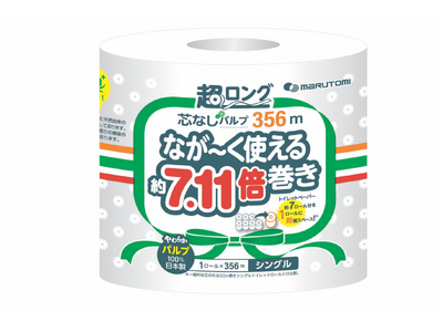 そのような声にお応えし「超ロングトイレットペーパー7.11倍巻シングル 1ロール」が誕生いたしました。多くのトイレットペーパー(シングル)1ロールの長さは50mですが、「超ロングトイレットペーパー約7.11倍巻シングル 1ロール」は356ⅿと通常の約7.11倍の長さを実現しています。200ⅿ以上のトイレットペーパーは丸富製紙株式会社の製法特許(※2)となっており、これまでの日本最長は「超ロングパルプ6倍巻300ⅿ」となっています。