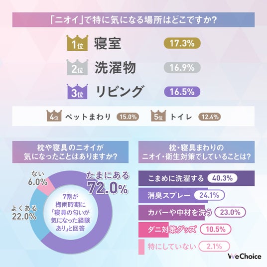 株式会社FoR/FoRINC.(本社:東京都渋谷区、代表取締役社長:高橋知暉)は、「みんなのかしこい選択がわかる」をビジョンに掲げるサイト「WeChoice」にて、日常の商品・サービス選びに役立つ情報を発信しています。今回は、20代~60代以上の男女100人を対象に、「梅雨時期のダニ・カビ・ニオイ」についてのアンケート調査を実施しました(WeChoice調べ)。