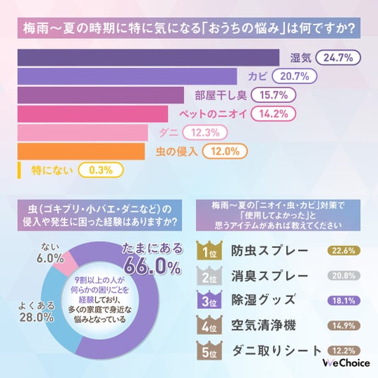 【梅雨~夏の時期に特に気になる「おうちの悩み」は何ですか?/虫(ゴキブリ・小バエ・ダニなど)の侵入や発生に困った経験はありますか?/梅雨~夏の「ニオイ・虫・カビ」対策で「使用してよかった」と思うアイテムがあれば教えてください】